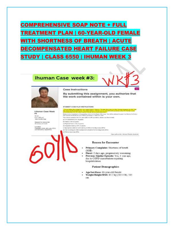 IHUMAN CASE ANALYSIS WEEK 3 – SHORTNESS OF BREATH 60-YEAR-OLD FEMALE | COMPLETE HPI, ... [Show More]