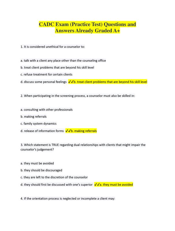 CADC EXAM (PRACTICE TEST) QUESTIONS AND ANSWERS ALREADY GRADED A+ $15.00 Add to Cart