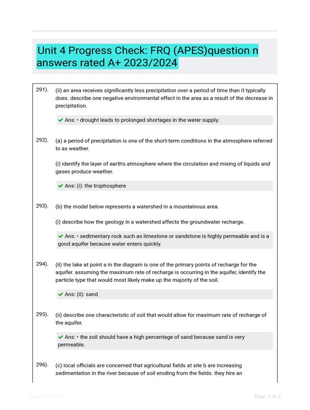 UNIT 4 PROGRESS CHECK: FRQ (APES)QUESTION N ANSWERS RATED A+ 2023/2024 $18.50 Add to Cart