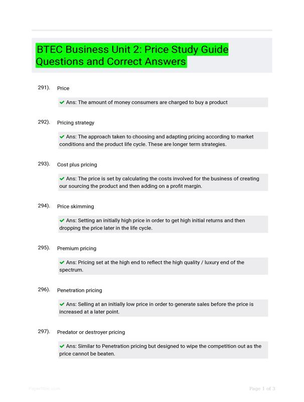 BTEC BUSINESS UNIT 2: PRICE STUDY GUIDE QUESTIONS AND CORRECT ANSWERS $18.50 Add to Cart