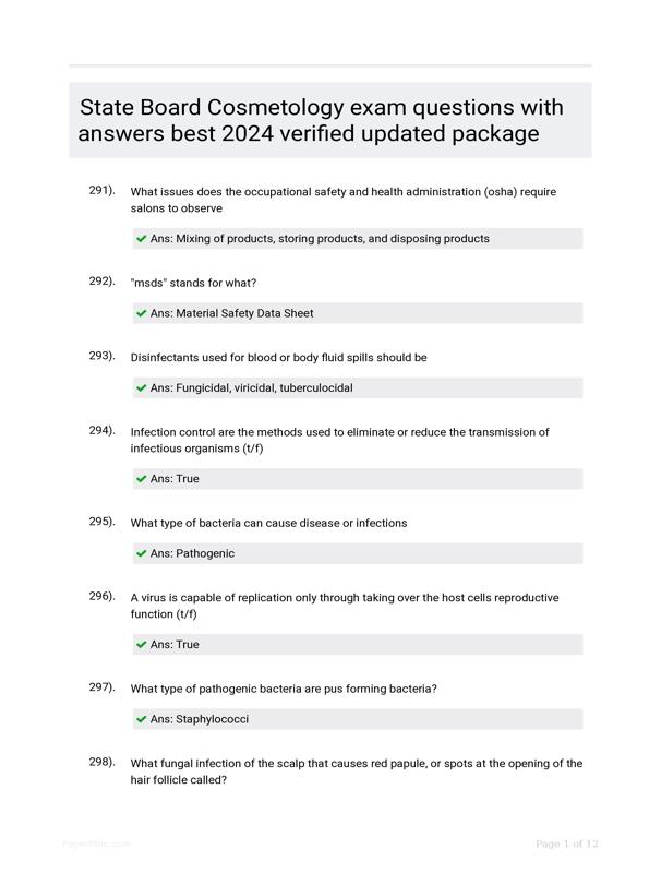 STATE BOARD COSMETOLOGY EXAM QUESTIONS WITH ANSWERS BEST 2024... $23.50 Add to Cart