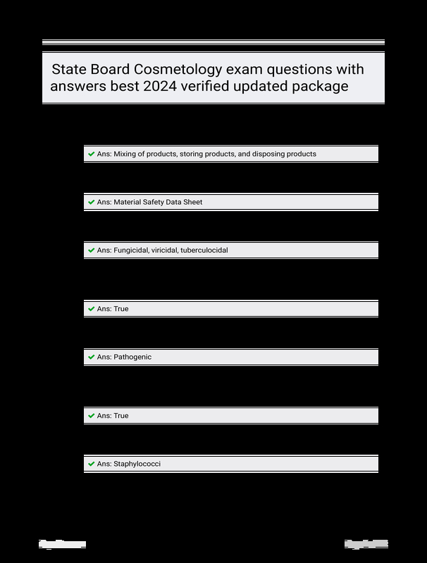 STATE BOARD COSMETOLOGY EXAM QUESTIONS WITH ANSWERS BEST 2024... $23.50 Add to Cart