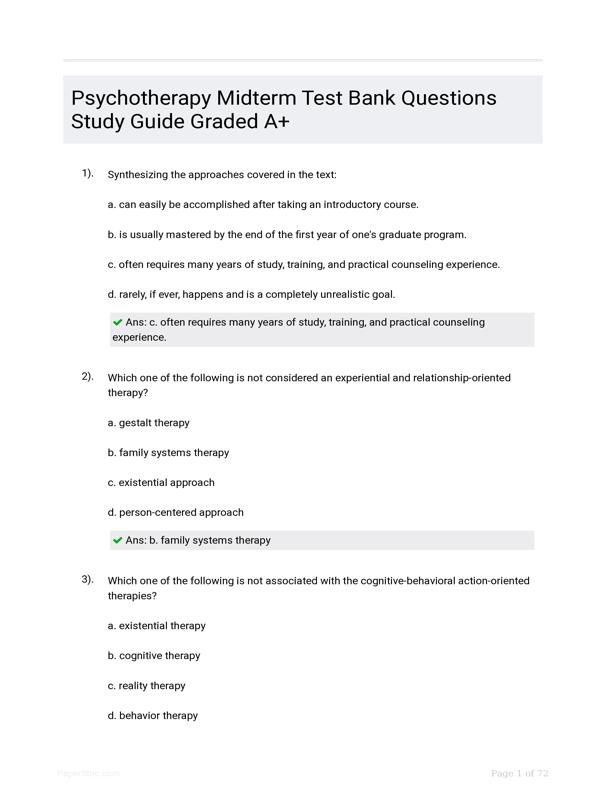 PSYCHOTHERAPY MIDTERM TEST BANK QUESTIONS STUDY GUIDE GRADED A+ $32.00 Add to Cart