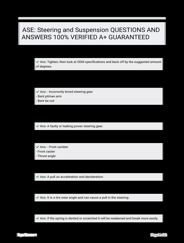 ASE: STEERING AND SUSPENSION QUESTIONS AND ANSWERS 100%... $20.50 Add to Cart