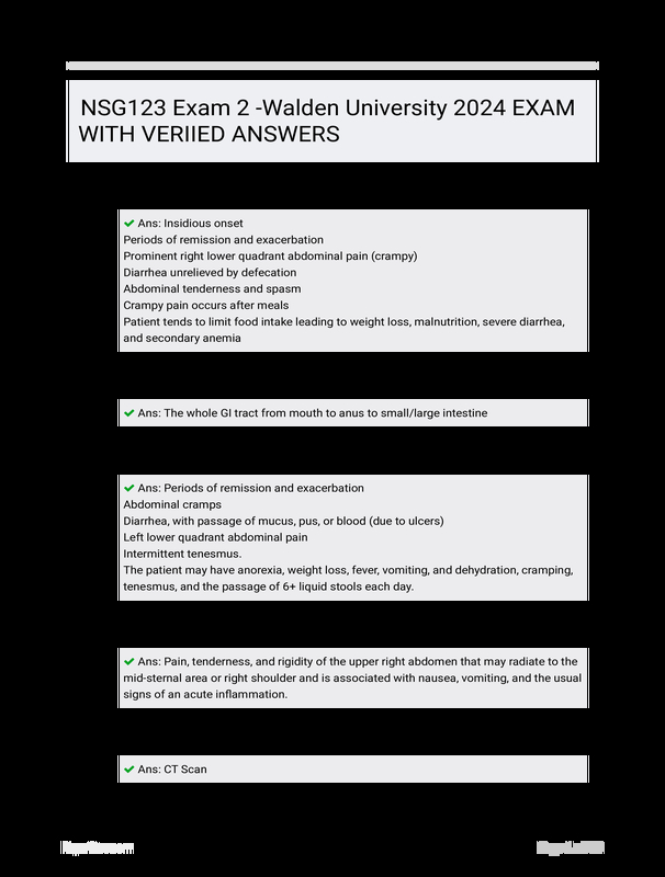 NSG123 EXAM 2 -WALDEN UNIVERSITY 2024 EXAM WITH VERIIED ANSWERS $26.75 Add to Cart