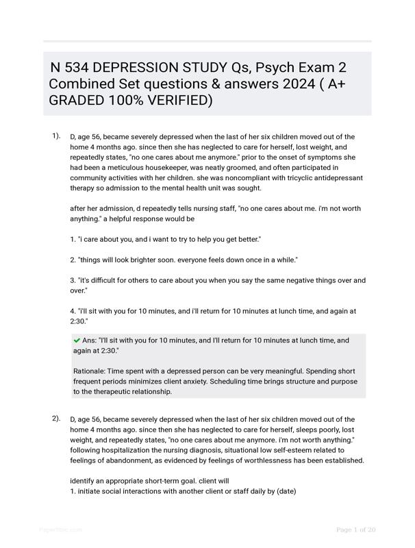 N 534 DEPRESSION STUDY QS, PSYCH EXAM 2 COMBINED SET... $26.75 Add to Cart
