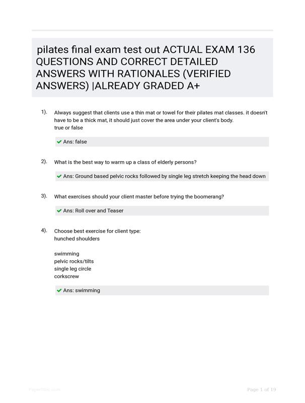 PILATES FINAL EXAM TEST OUT ACTUAL EXAM 136 QUESTIONS AND... $26.75 Add to Cart