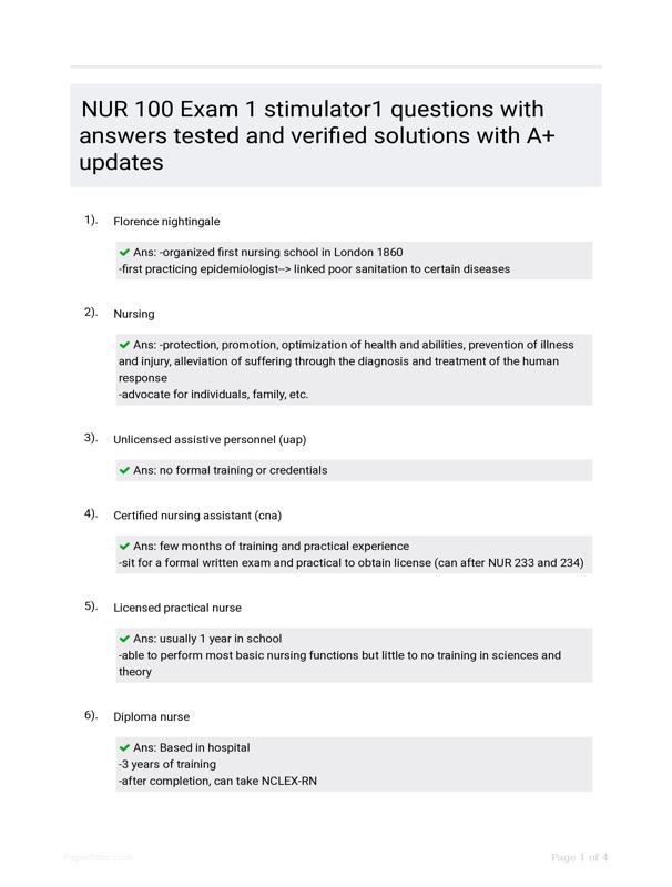 NUR 100 EXAM 1 STIMULATOR1 QUESTIONS WITH ANSWERS TESTED AND VERI ... $9.50 Add to Cart