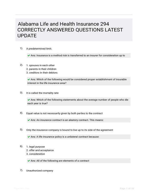 ALABAMA LIFE AND HEALTH INSURANCE 294 CORRECTLY ANSWERED... $28.50 Add to Cart