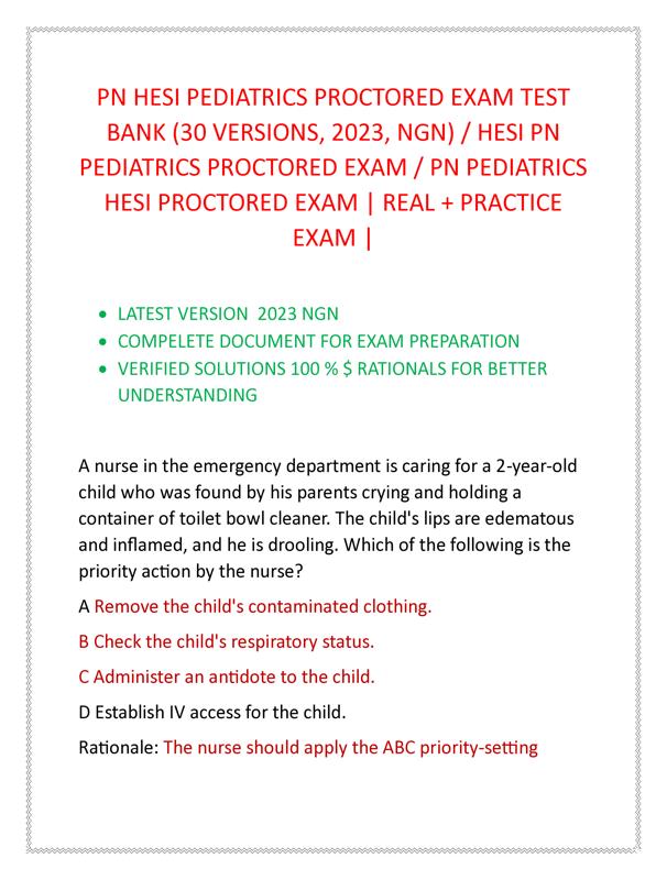 PN HESI PEDIATRICS PROCTORED EXAM TEST BANK (30 VERSIONS,... $29.00 Add to Cart