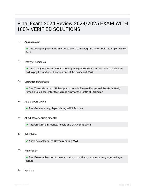 FINAL EXAM 2024 REVIEW 2024/2025 EXAM WITH 100% VERIFIED SOLUTIONS $20.50 Add to Cart