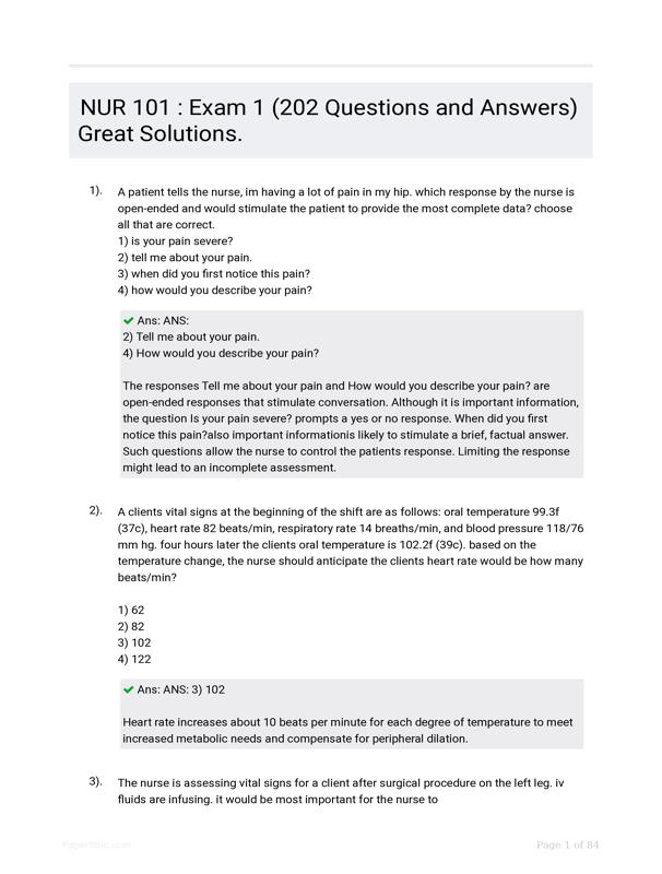 NUR 101 : EXAM 1 (202 QUESTIONS AND ANSWERS) GREAT SOLUTIONS. $23.00 Add to Cart