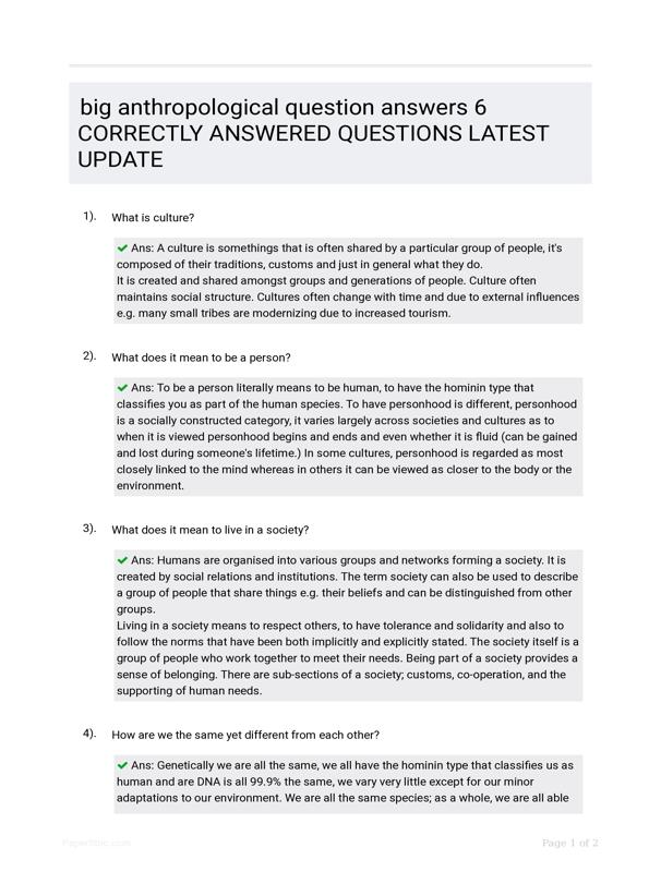 BIG ANTHROPOLOGICAL QUESTION ANSWERS 6 CORRECTLY ANSWERED... $18.50 Add to Cart