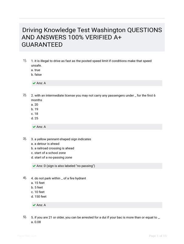 DRIVING KNOWLEDGE TEST WASHINGTON QUESTIONS AND ANSWERS 100%... $24.00 Add to Cart