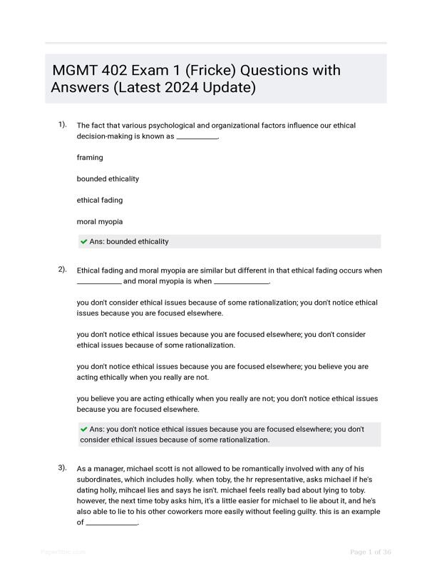 MGMT 402 EXAM 1 (FRICKE) QUESTIONS WITH ANSWERS (LATEST 2024 UPDATE) $28.50 Add to Cart