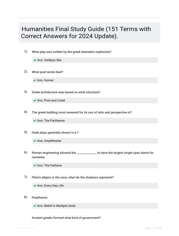 HUMANITIES FINAL STUDY GUIDE (151 TERMS WITH CORRECT ANSWERS FOR ... $14.00 Add to Cart