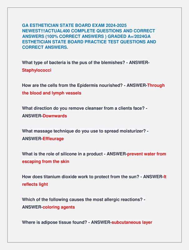 GA ESTHETICIAN STATE BOARD EXAM 2024-2025 NEWEST!!!ACTUAL400... $15.00 Add to Cart
