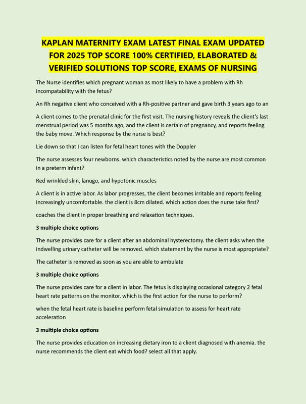 KAPLAN MATERNITY EXAM LATEST FINAL EXAM UPDATED FOR 2025 TOP SCORE $13.76 Add to Cart